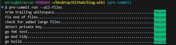 Biz şu anlık test amaçlı çalıştıracağımız için hook triggerlanmadan yeni kontroller eklediğinizde her seferinde pre-commit atmak zorunda değilsiniz. Terminal üzerinde